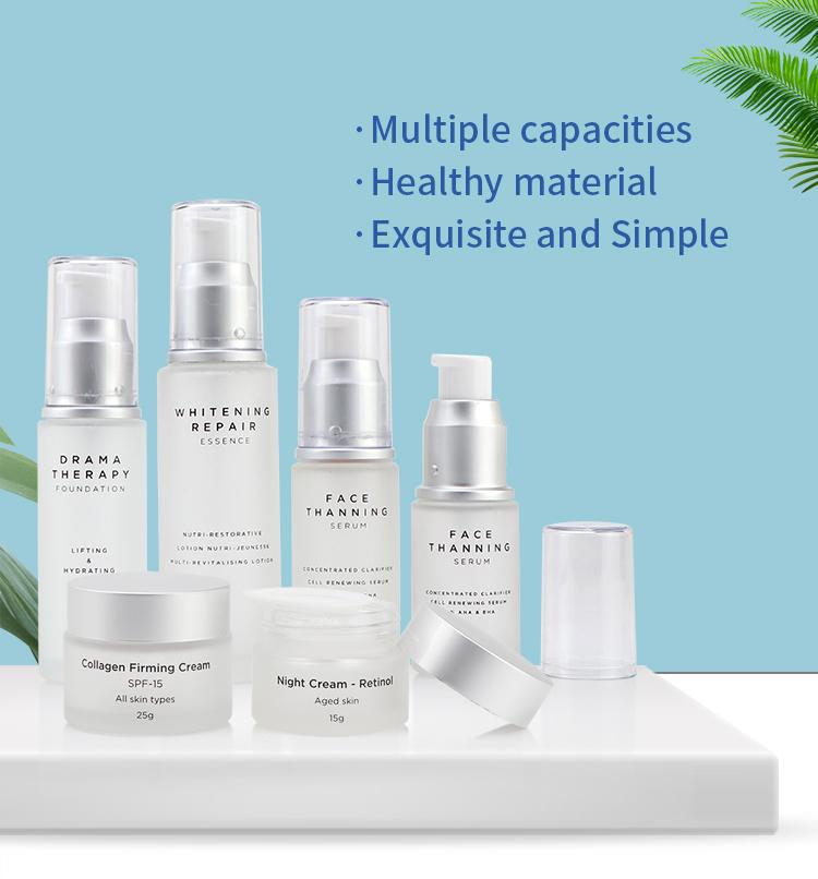 | Product Name | Cosmetics packaging 15ml 20ml 25ml 30ml 50ml 80ml personal skin care cream glass bottle Cosmetics silver cover set manufacturers | ||